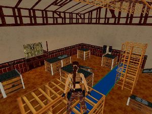 Einer der wichtigsten Räume im Haus ist dieser. Hier kann man sich mit der Steuerung von Lara vertraut machen. Acht Übungsabschnitte gibt es hier, sie betreffen das Springen, Hangeln, Kriechen und sprinten. Läuft man bei der Empfangshalle im Erdgeschoss in den rechten Gang, kommt man direkt in die Turnhalle. Während des Übens teilt Lara die Aufgaben akustisch mit. Man kann die Turnhalle auch nur zum Durchgang zum Schwimmbad nutzen.